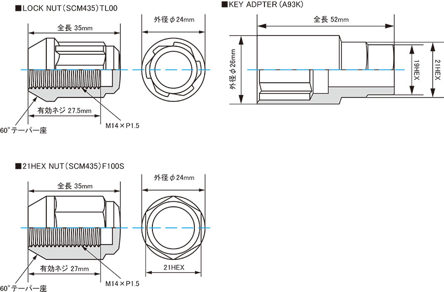 ※同梱ナットは、F100S(メッキ)/F100SB(ブラック)、21HEXとなります。 |