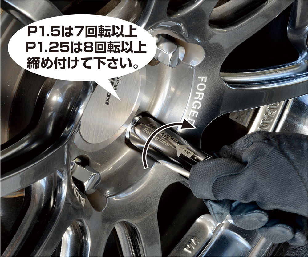 ※アルミ軽合金ナットの場合: ネジピッチP1.5は10回転以上、ネジピッチP1.25は12回転以上、締め付けて下さい。