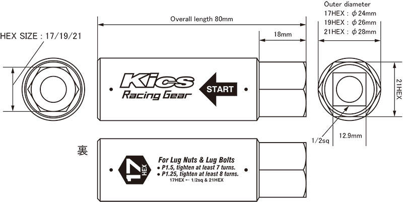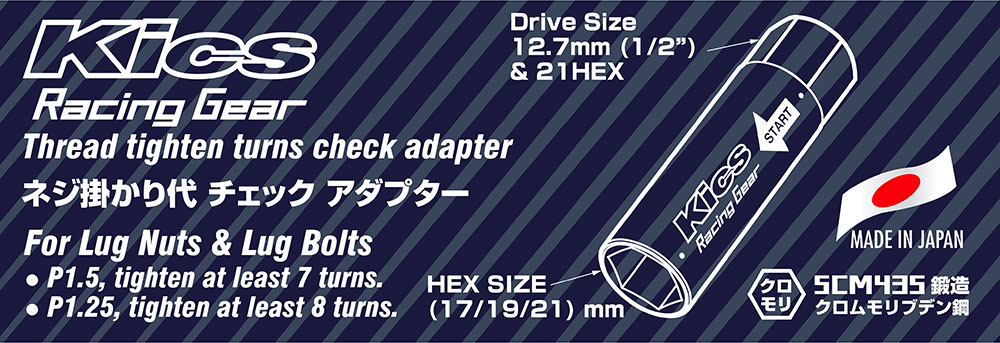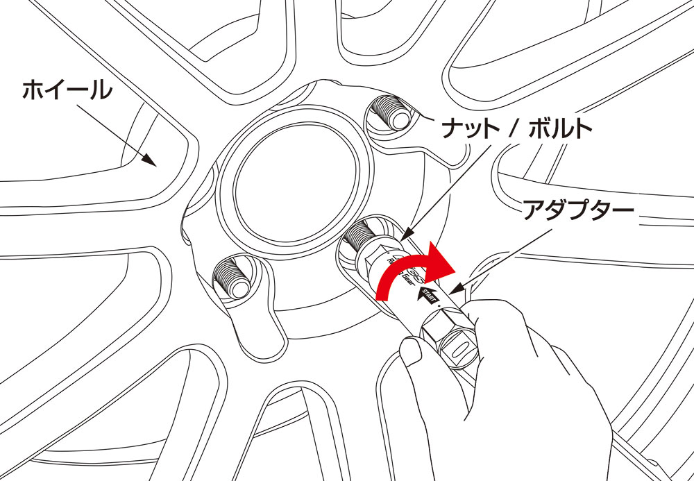 アダプターに、矢印(START)を印刷しました。STARTの位置から、何回転で(ナット/ボルト)が止まるかで ネジの掛かり代(はめあい量)を確認します。 ※ナットの取り付けは手で確認しながら行って下さい。インパクトレンチの使用は不可! ※締め付けは必ずトルクレンチにて指定トルク値で締め付けて下さい。